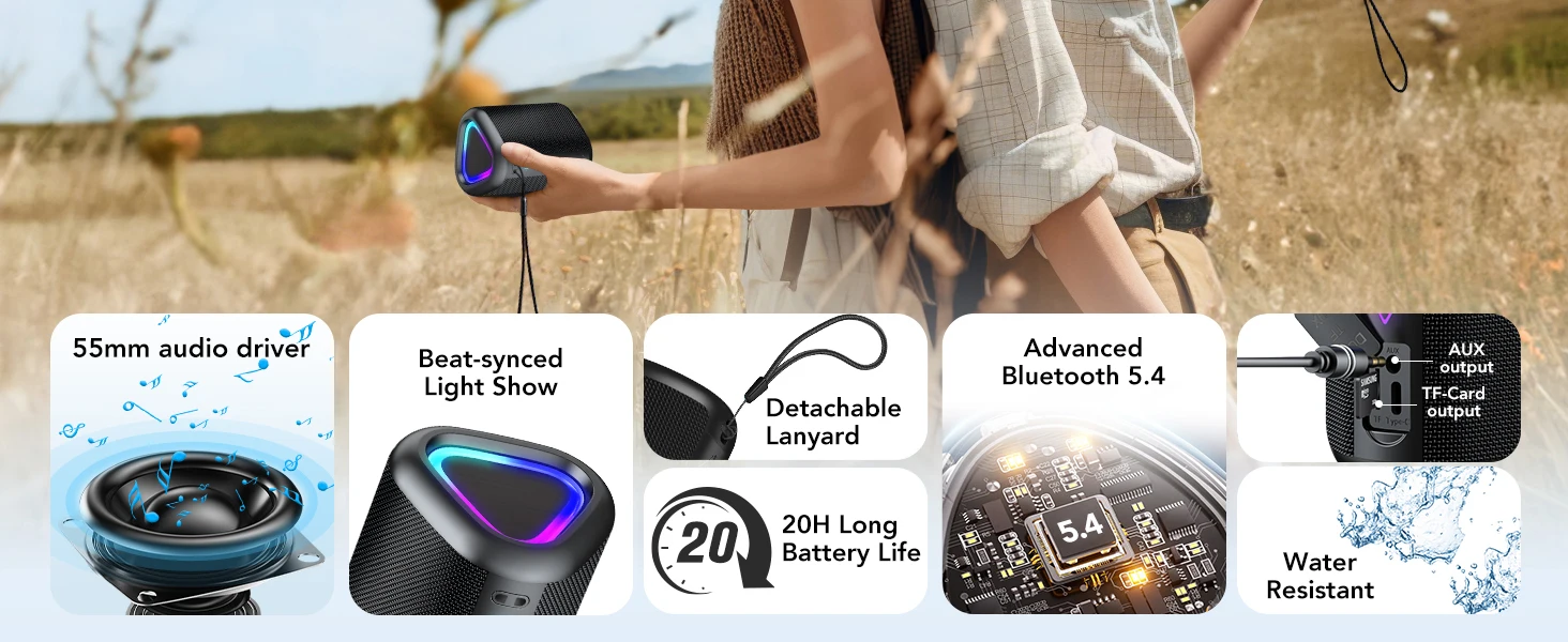 The outdoor wireless speaker adopts advanced Bluetooth 5.4 technology. Provides fast and stable connection, 1 S to complete the connection. Wide compatibility, pairs with most Bluetooth-enabled devices, such as mobile phones, MP3, TVs, tablets, laptop devices. Support multiple digital audio file decoding,TF,SD card.