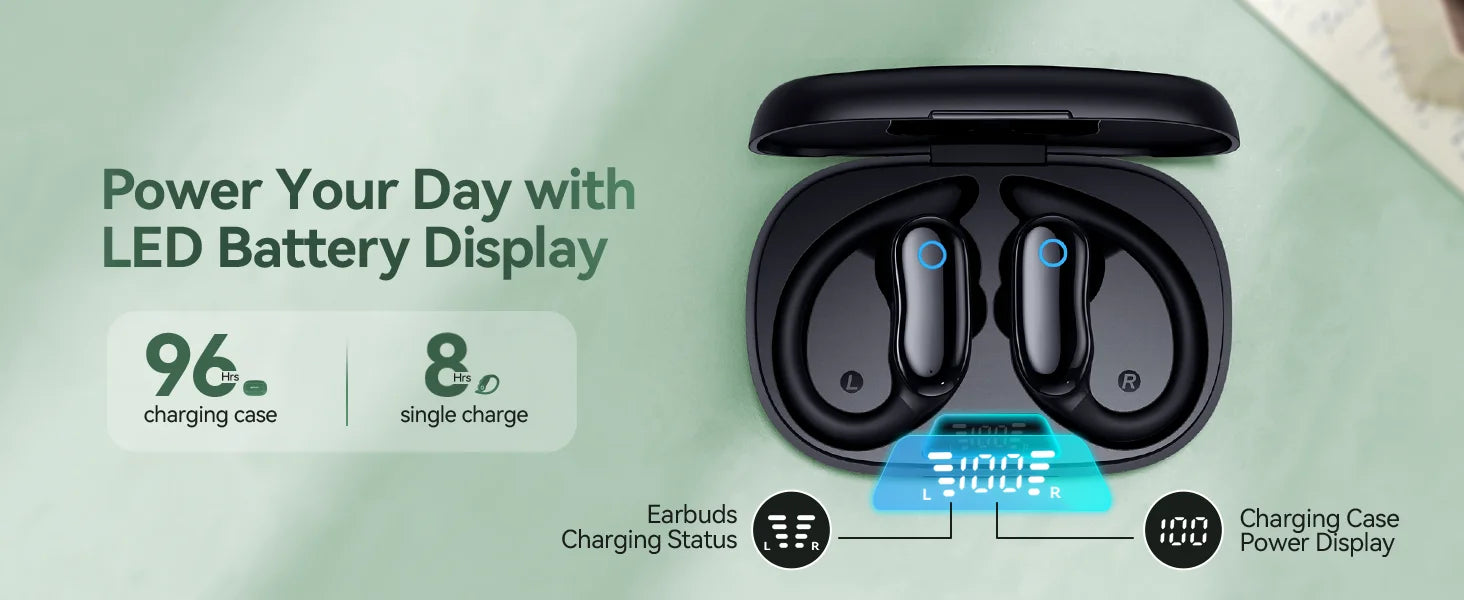 On single fully charge, our Bluetooth earbuds last up to 8 hours. With portable charging case, it provides up to 96 hrs of continuous playback, ensuring that your music never has to end. The dual led display easily monitors the real-time battery levels of both the case and wireless earbuds on the go. Additionally, the Type-C fast charging capability makes recharging the sport headphones a breeze and let you dive back into your groove.